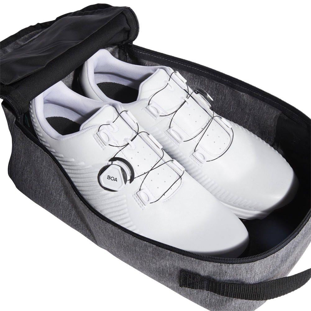 Change into your golf cleats with ease in the Adidas Golf Shoe Bag. The Golf Shoe Bag lets you swap out your casual shoes for golf cleats as you transition from the parking lot to the course. Keep extra balls, tees and small valuables in the front pocket.