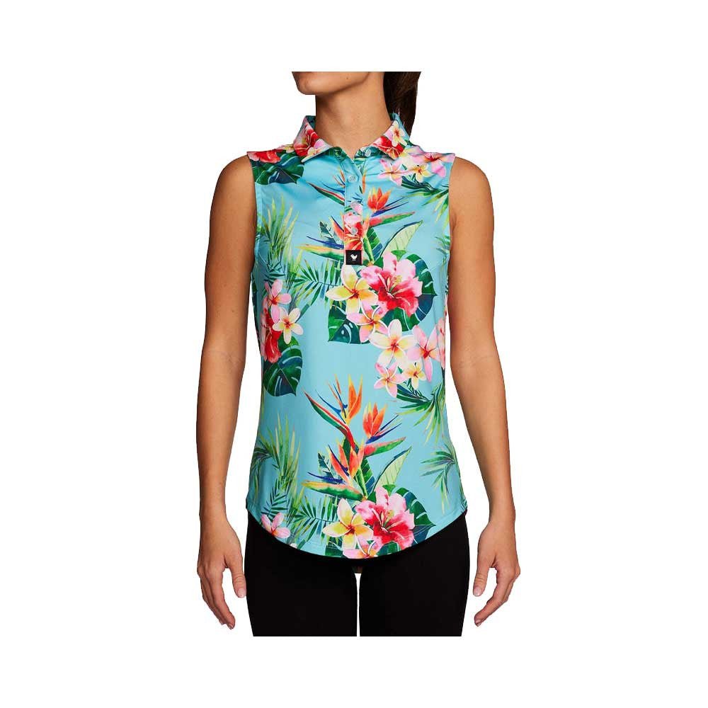Whether it's a vacation spot, favorite course, tall iced bevie, or funky jam - we always be keeping it tropical. This women’s sleeveless, bold tropical floral patterned polo is made with 4-way stretch for the golf course.