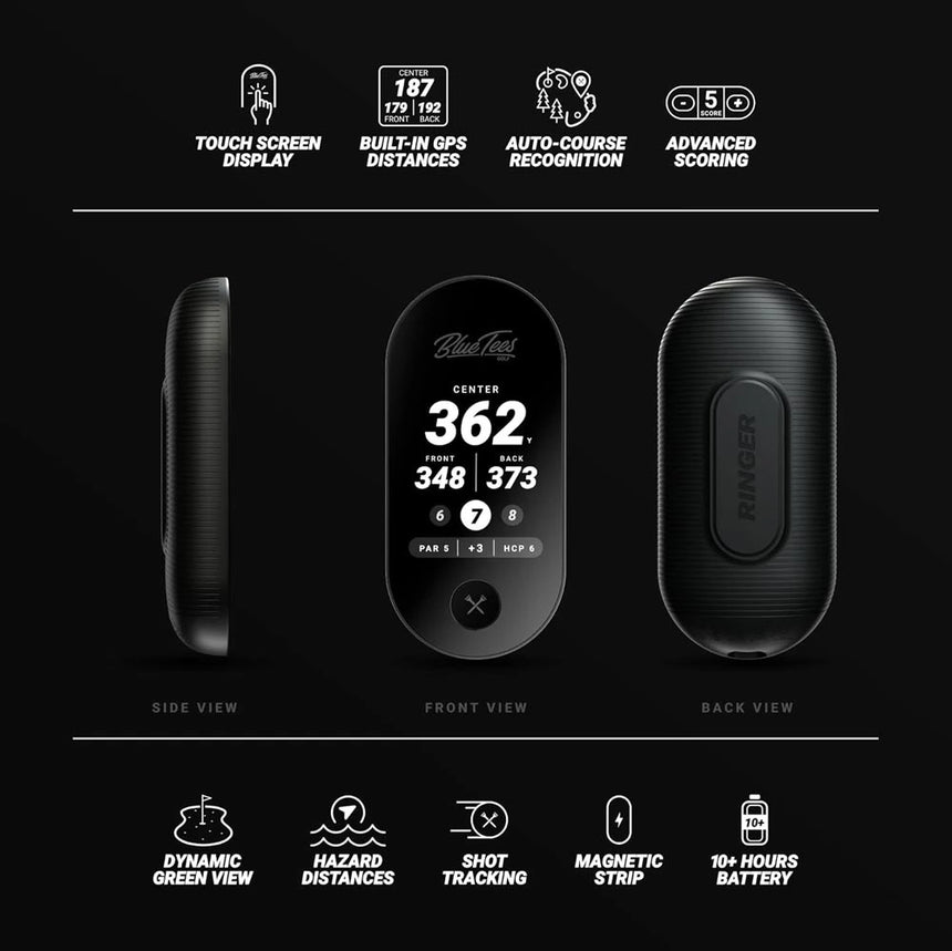 With a powerful built-in magnet, the Ringer securely mounts to carts or MagHubs for easy access. Its seamless integration with the Blue Tees companion app unlocks advanced analytics post-round, offering deep insights into your game—from greens in regulation to putting averages. Whether you're navigating hazards or measuring your drives, Ringer keeps you informed and in control.