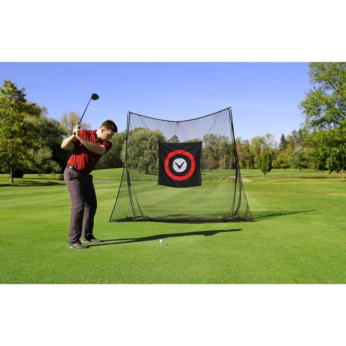 The Callaway Base Hitting Net is a 8' tall x 7' wide golf training aid made to help you take full swings with the feedback of a real ball without being at the course. The premium net is designed for ball speeds up to 150mph and features a target in the middle for working on aim. The base and structure of the hitting net is made from stainless steel tubing with stakes for anchoring the net in to the ground. The Callaway Base Hitting Net comes in a carry case with handles for easy transportation.