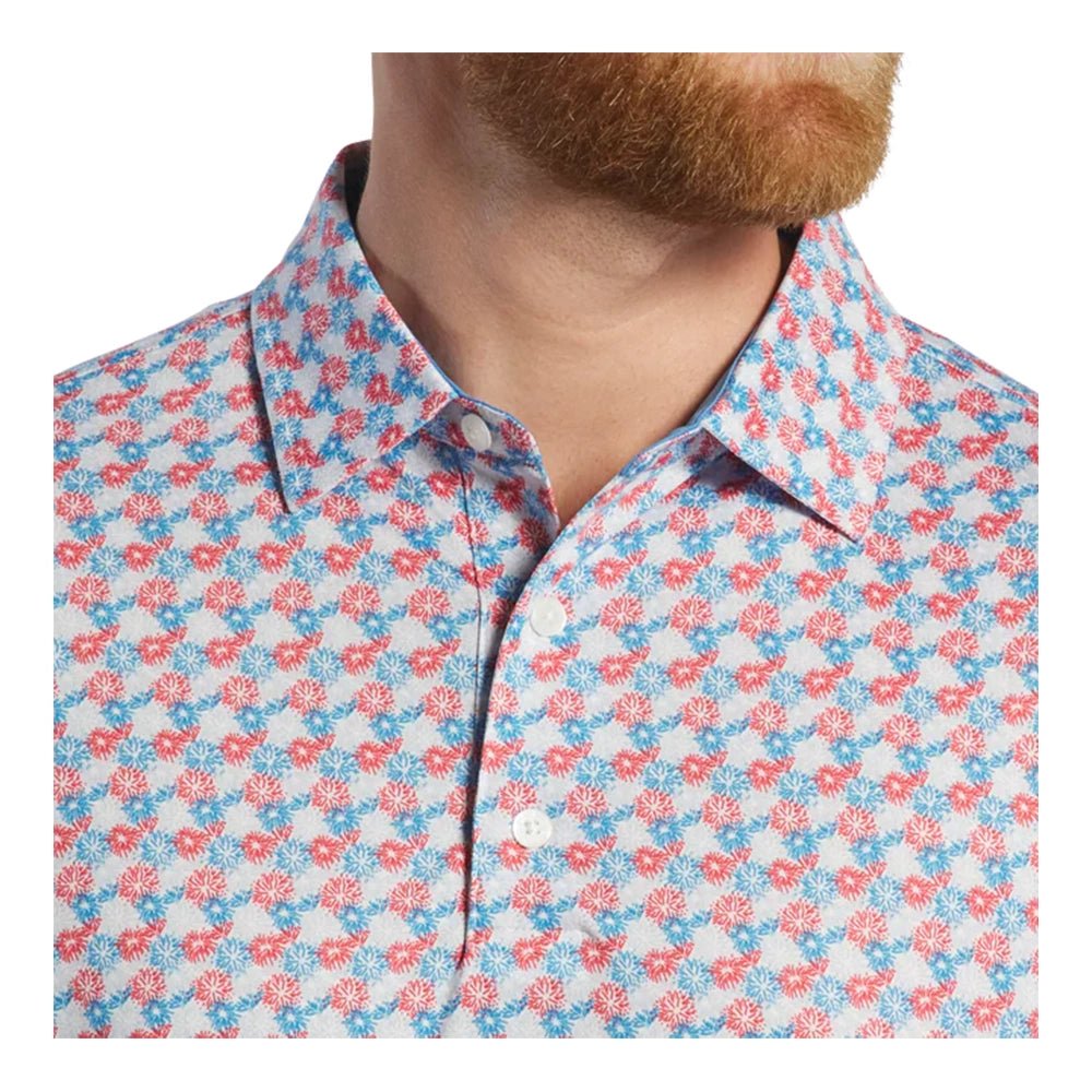 Embrace the spirit of America with the FootJoy Firework Lisle Polo, a men's golf shirt designed to celebrate patriotism and style. This shirt features a unique design that incorporates red, white and blue fireworks in a festive and eye-catching way.