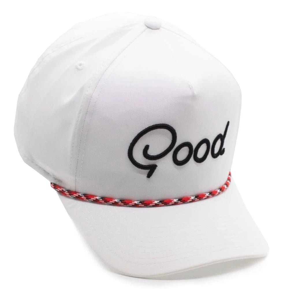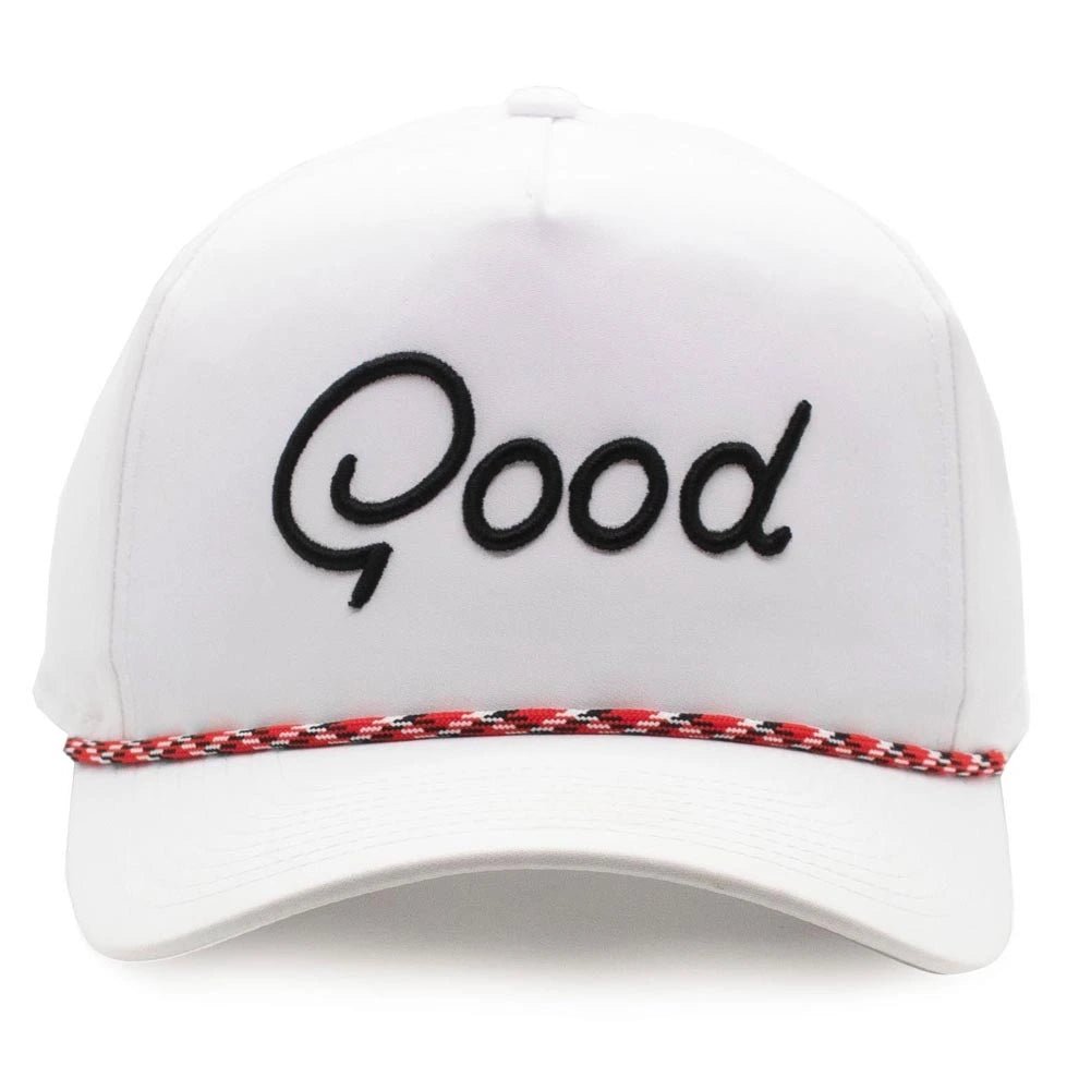 Step into classic golf style with the Good Good The OG Rope Golf Hat — the hat that started it all. Featuring a clean white design with bold black “Good” embroidery and a striking red, black, and white rope detail across the brim, this hat delivers the perfect blend of timeless flair and modern golf attitude. Its structured five-panel construction offers a confident, tour-inspired fit, while the crisp colorway makes it a versatile choice that pairs effortlessly with any outfit on or off the course.