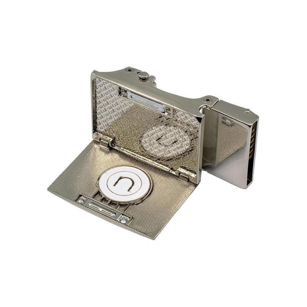 - Buckle has a brushed nickel finish and flips open to reveal a hidden 2 sided ball marker
