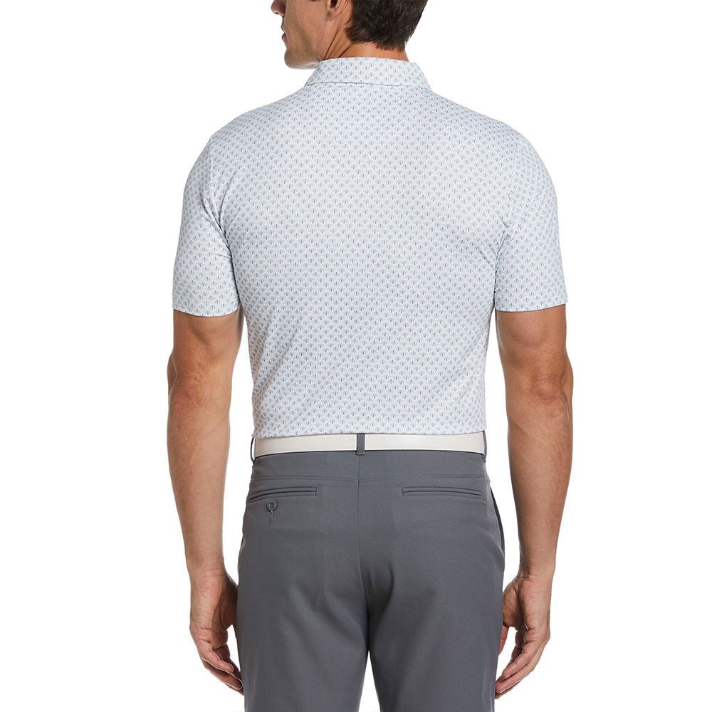 An allover geo print brings a fun retro vibe to this Original Penguin men’s golf shirt. The single knit fabric is enhanced with stretch for flexible comfort as you bend and swing and it includes 30% recycled polyester. With its comfortable self collar, breathable short sleeves, and distinctive Pete sticker logo, this golf top is an easy choice whether you're heading out for a few rounds of golf or a few rounds of drinks.