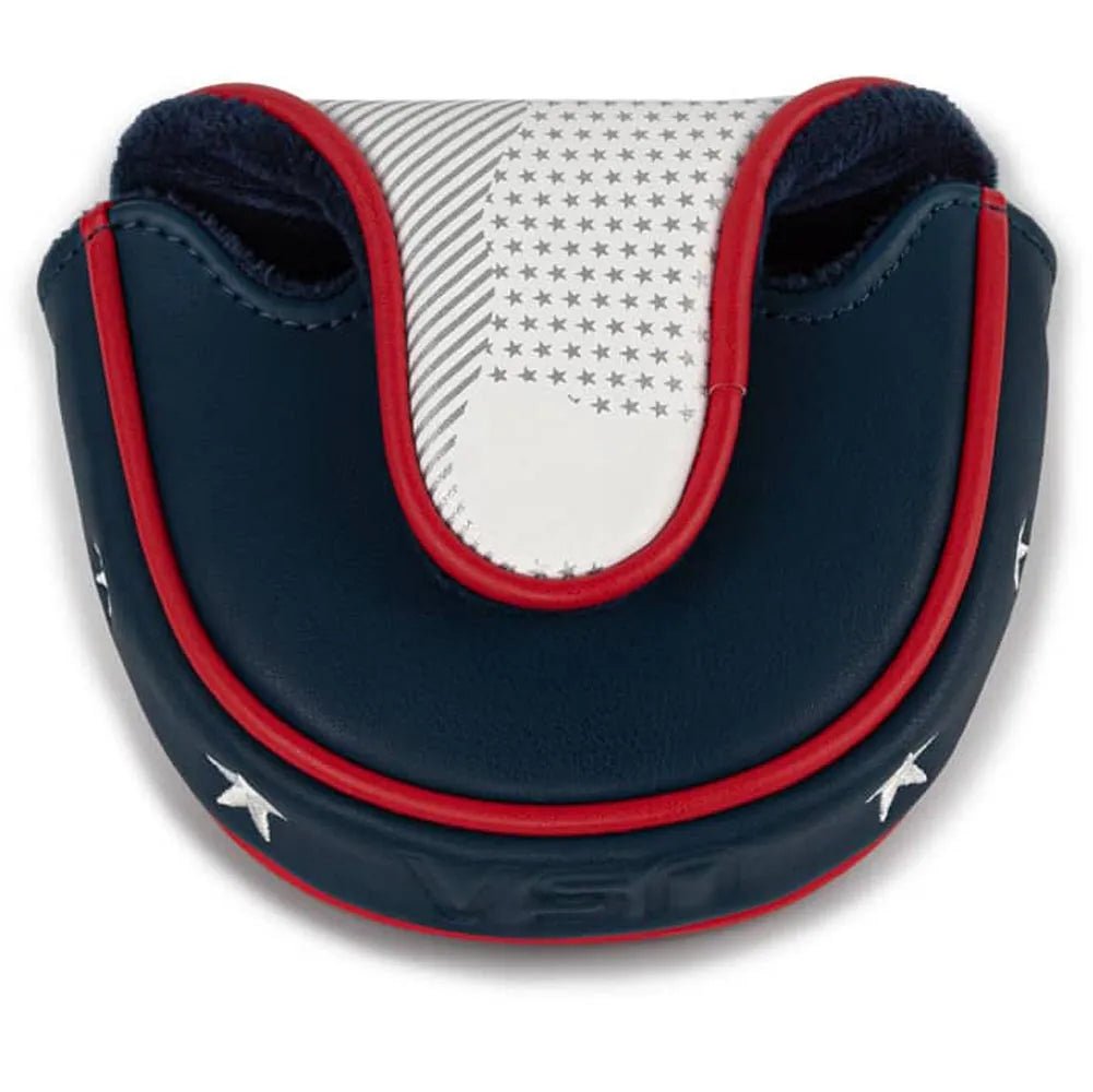 Show your patriotism and protect your mallet putter in style with the Ping Patriot Mallet Putter Cover. The navy PU leather PING Tour logo, the red, white and blue embroidered American-flag patch, and a camo pattern formed by hundreds of stars ensure your mallet has never had a home like this. The durable polyurethane material will hold up over countless rounds and retain its quality. Navy velour lining complements the look while protecting your mallet.