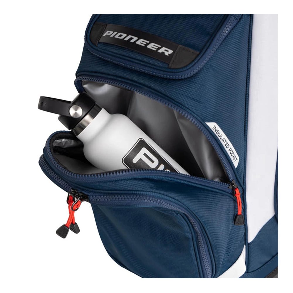 Bring all the things you want to have on hand: extra golf balls, the rain gear and sweaters, rangefinder, valuables. There’s a home for everything in the new Pioneer’s 16 pockets and 35 liters of pocket volume. The 15-way top has been redesigned to allow for a larger putter well. A removable built-in valuables pouch is one of many extra touches that make the Pioneer so appealing.