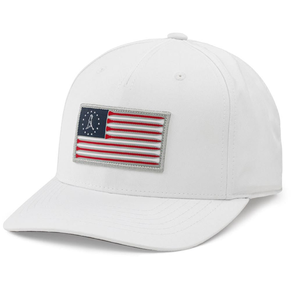 Look closely and you’ll see where the Stars & Tees gets its name -- from the stripes in the flag being made of golf tees. Mr. PING, a star himself, makes an appearance encircled by stars. Whether the flag is presented on a white or navy cap, this colorful emblem of freedom pops. It’s made of 50% polyester and 47% nylon, with Spandex added for stretch comfort.