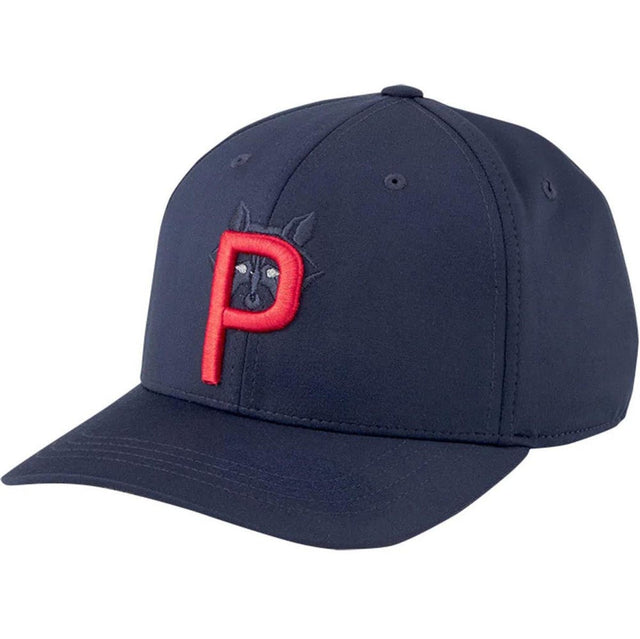 The Puma Raccoon P 110 Snapback Hat will be a go-to for the golf season. The embroidered classic P with glowing eye raccoon on the front panels incorporates the family of raccoons that have made their home behind the first tee box at Torrey Pines, the course hosting 2021's third major. The six panel hat with slightly curved brim creates a cap for any occasion.