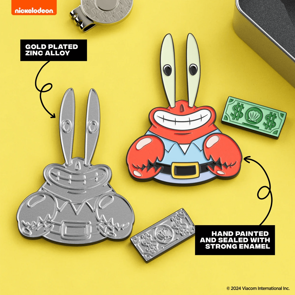 Bring some Bikini Bottom business to the golf course with the Putt Buddies Mr. Krabs Divot Tool with Me First Dollar Ball Marker. Featuring everyone’s favorite money-loving crustacean, this hilarious golf accessory combines collectible charm with practical functionality. The design showcases Mr. Krabs in all his glory, paired with his prized “Me First Dollar” as the removable ball marker—making it a fun and functional addition to any golfer’s bag.
