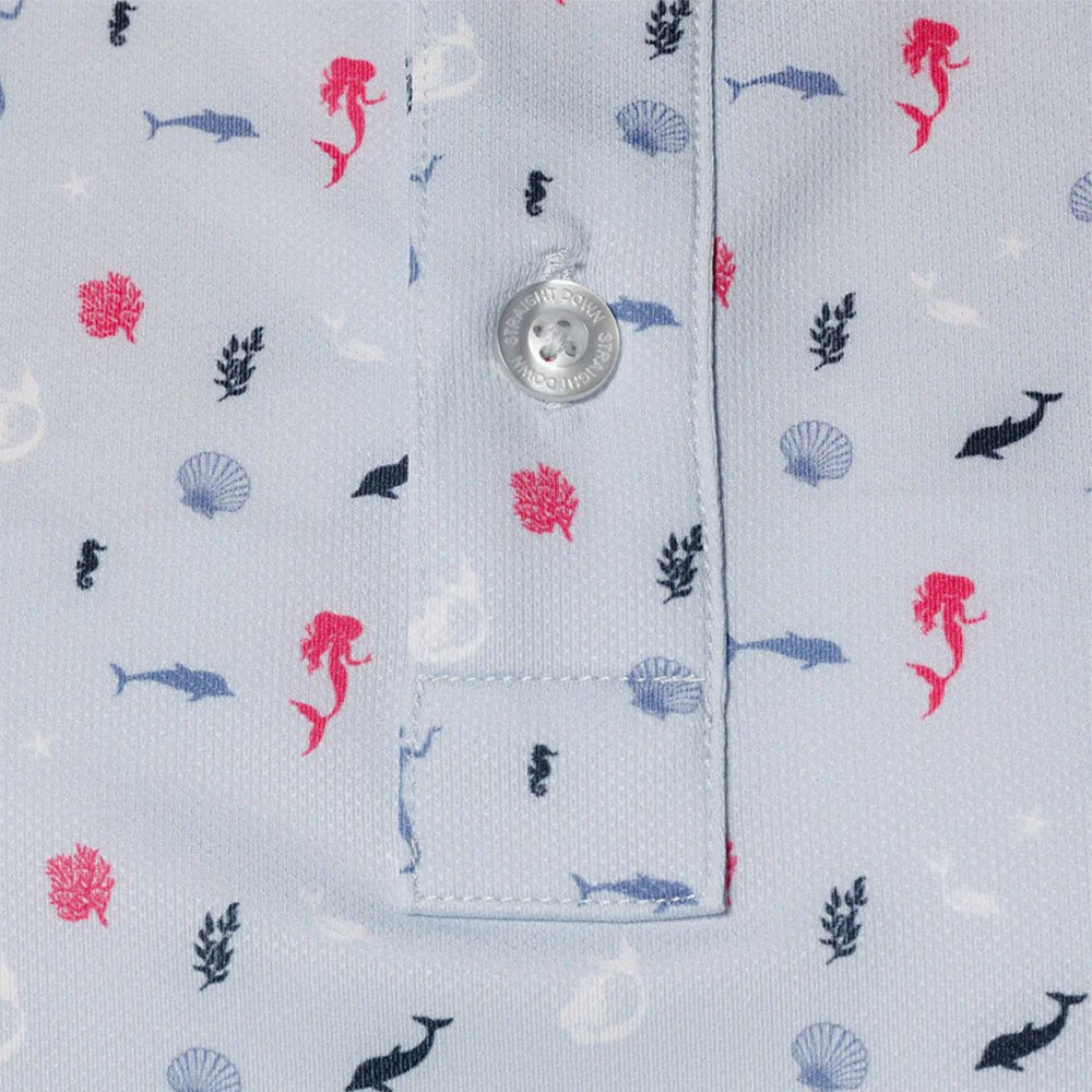 Hear the siren's call! The Lorelei Polo is covered in a fun mermaid, siren and sea life print. Made from soft performance-ready micro-pique fabric. Stay flat collars, moisture and sweat wicking material, and 4-way stretch combine to make this Straight Down golf polo excel on the golf course.