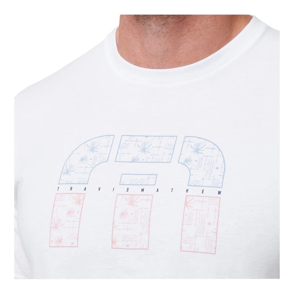The TravisMathew Shoes Optional Tee is a classic logo tee. This men's t-shirt features the iconic TravisMathew logo with a tropical beach twist, making it a versatile and conversation-starting piece.