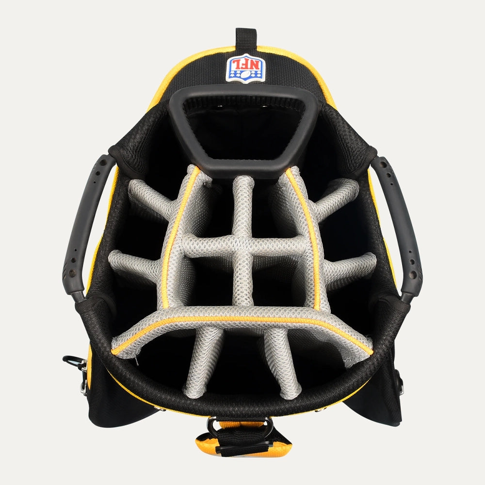 Engineered to be sturdy and durable with player-appreciated details like cooler pocket and easy-access magnetic valuables pouch. The base of the NFL Cart Bag is designed to fit securely on a riding cart or trolley, while premium logos and approved colors show everyone which team you're really on. A 10.5 inch 14-way top provides a dedicated slot to each one of your clubs.