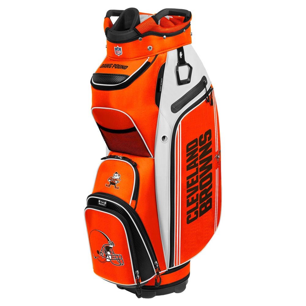 The NFL Cleveland Browns The Bucket Cart Bag builds on its predecessor with even more features to serve your needs on the golf course. The bag has a total of eight zippered pockets placed in convenient, easy to reach locations. The innovative Bucket Cooler pocket allows you to keep your beverages cold throughout your entire round. Other pockets include a ball pocket, range finder pocket, accessory pocket, dual apparel pockets and a velour lined valuables pocket.
