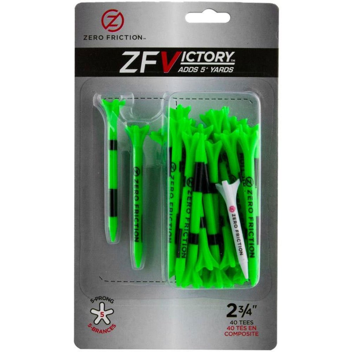 The Zero Friction ZFVictory 5-Prong Tees come in a pack of 40 total, at 2 ¾” in length. The specially designed 5-prong contoured performance cup allows for reduced contact area between the ball and tee resulting in longer, straighter drives. The ZFVictory 5-Prong Tees are constructed from a durable bio-composite material that attributes to its stability and rigidity when piercing the turf, as well as less breakage. Each pack includes a bonus 1 ¾” hybrid 3-prong tee.